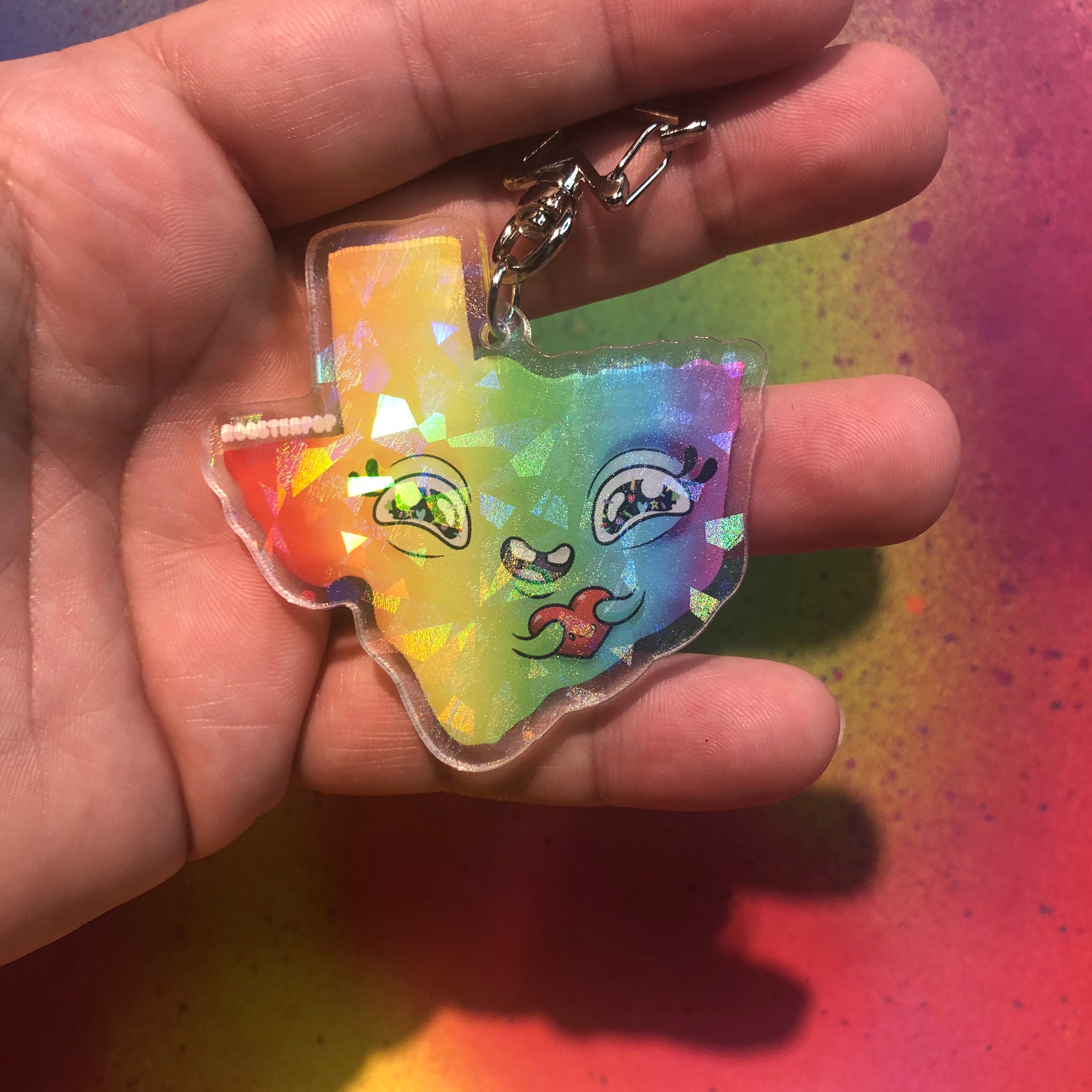 This cutie Texas PRIDE is a limited edition acrylic pin with sparkle effect on the front side. This cutie is about 3”x3” and has an attached clip in the shape of a star! Celebrate your Pride this year and help support my LGBT-XYX small business.